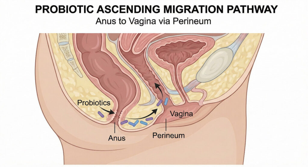 이것이 바로 ‘항문에서 질로의 이동(Ascending migration)’ 메커니즘입니다. 여성의 신체 구조상 항문과 질이 가깝기 때문에 가능한 일이며, 이것이 여성 유산균이 효과를 내는 핵심 원리입니다.
